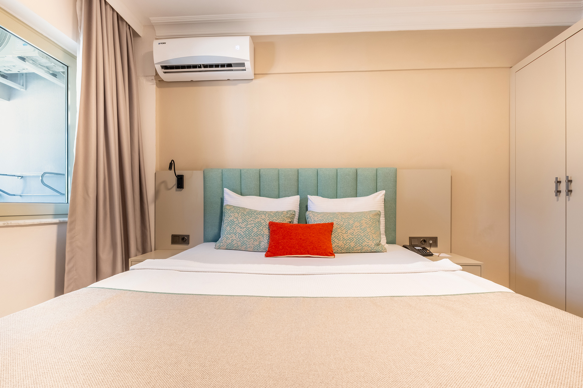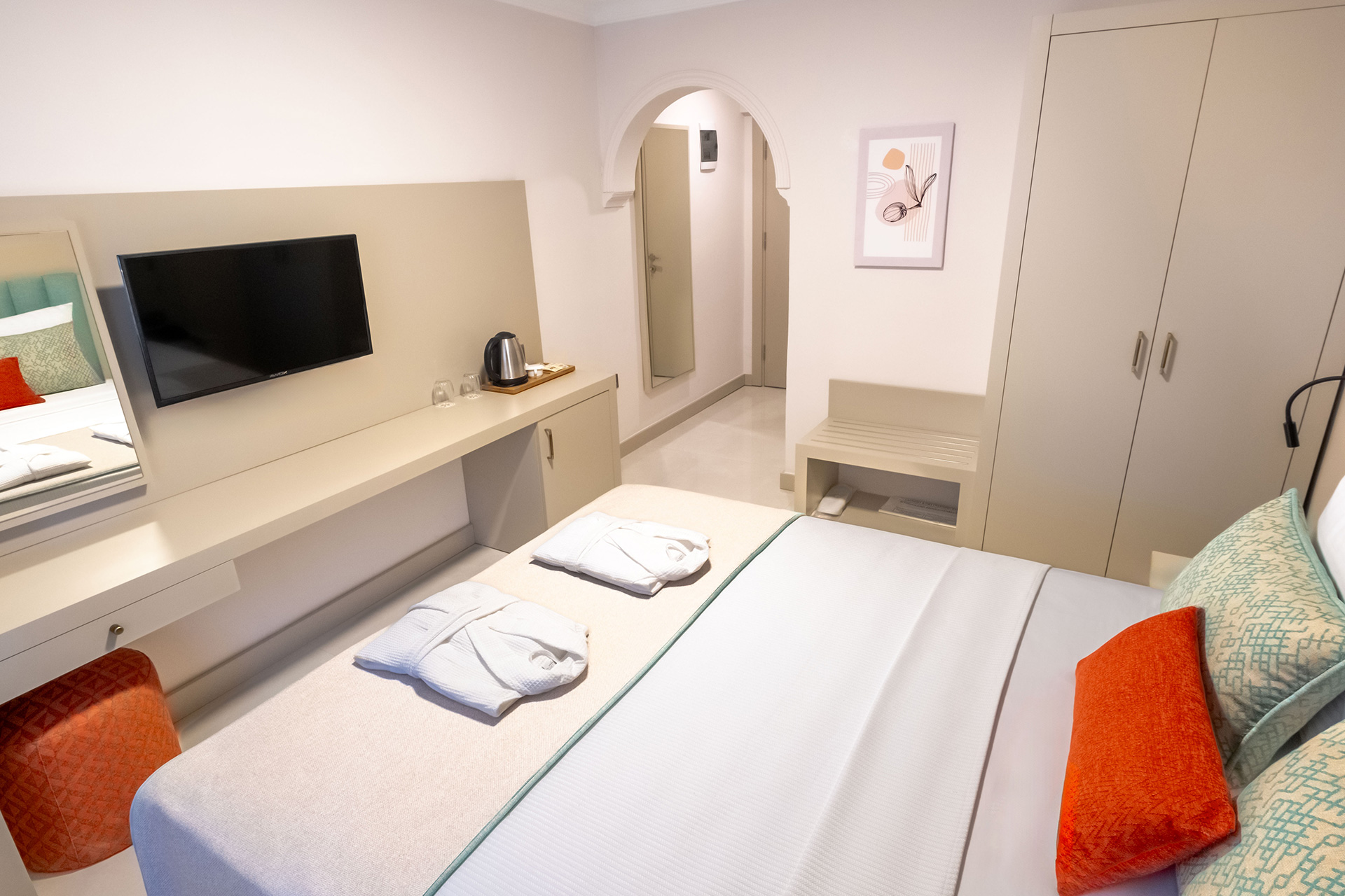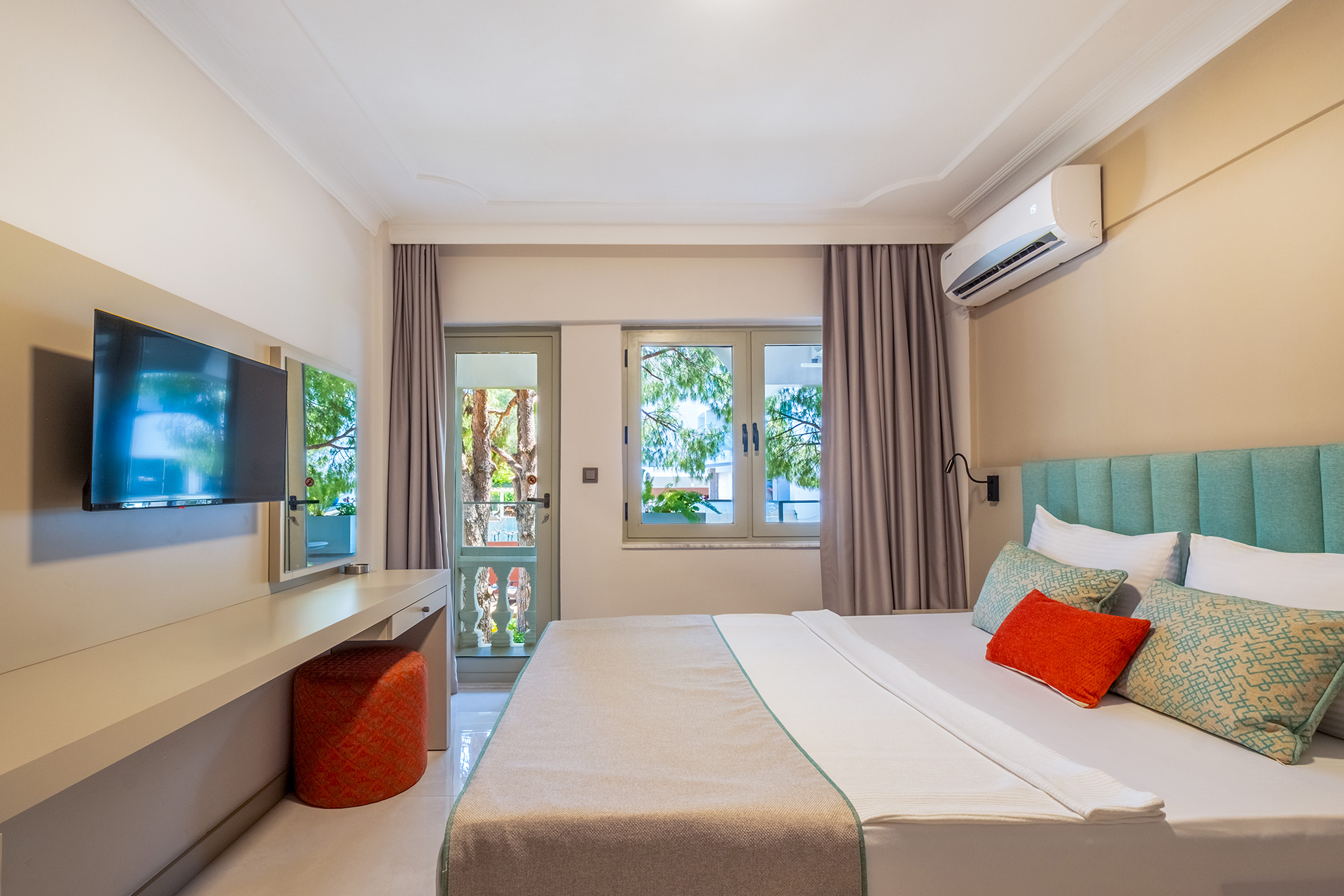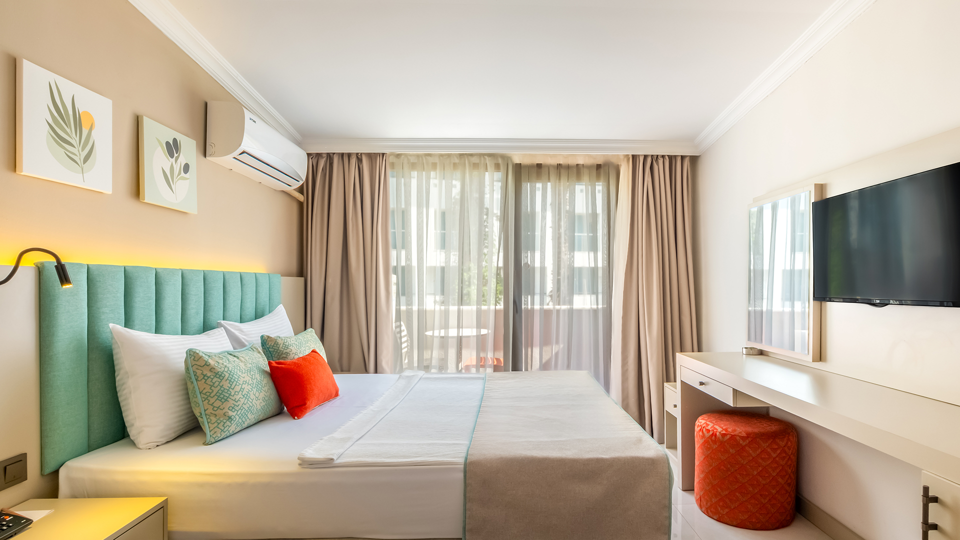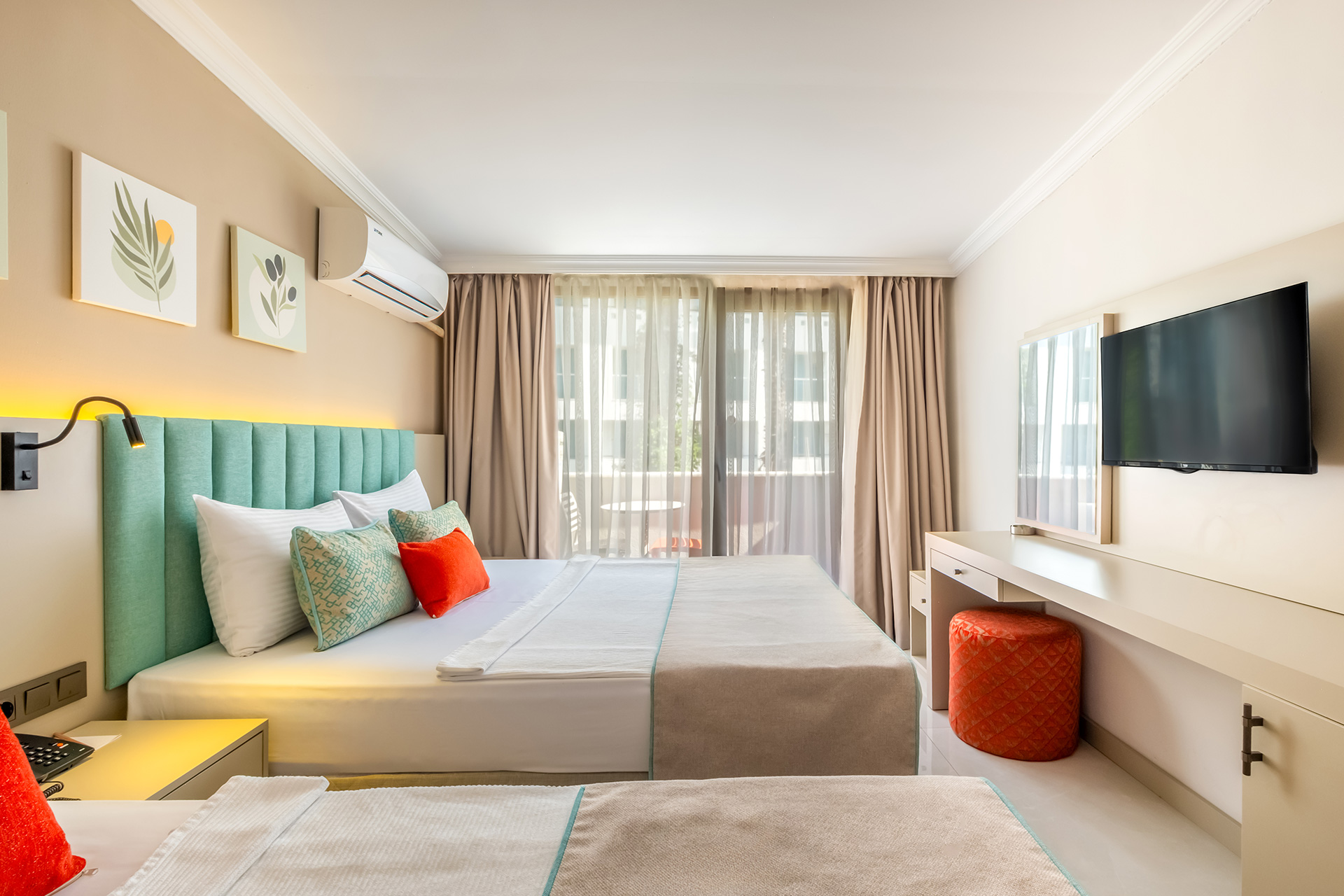 İç mekânlarda kullanılan dinlendirici ve birbiriyle uyumlu renkler, temiz, düzenli ve çağdaş bir görünüm oluşturur. Antalya standart oda konsepti ile örtüşen tasarımlarımız, tatil boyunca huzurlu ve keyifli bir ortamda vakit geçirme beklentinizi kusursuzca karşılar.